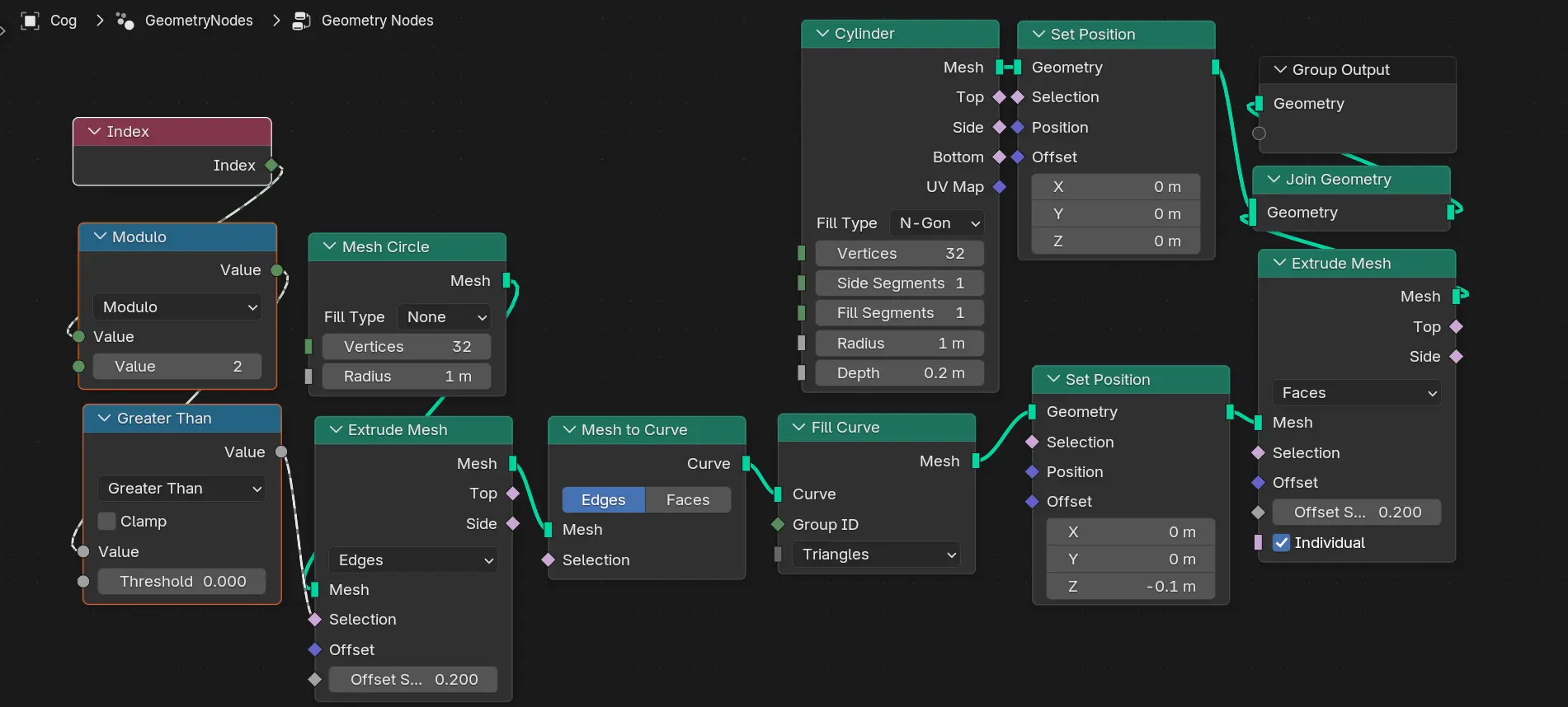 This setup allows fully procedural cogs with adjustable parameters, making it easy to experiment with different designs. It’s a neat example of how Geometry Nodes can handle complex procedural geometry entirely inside Blender.